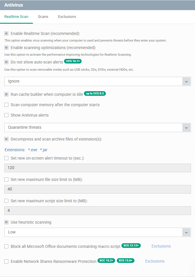 Configuration Templates > Create Configuration Profiles > Profiles For Windows Devices > Create Windows Profiles > Antivirus Settings